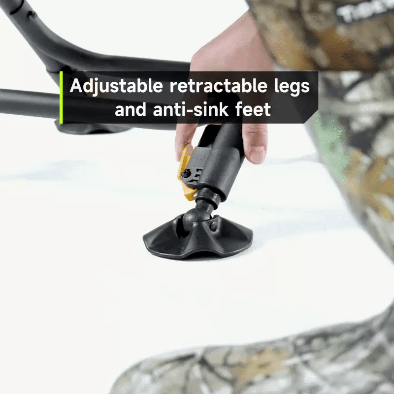 360° Silent Rotation: Scan your surroundings without spooking your prey. The chair features adjustable height legs from 18" to 20.5", accommodating various users. Its easy setup and storage make it portable, with a Velcro design and adjustable shoulder strap.